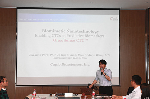 Seungpyo Hong首席技术官首先结合正在美国进行的开发和临床试验,分享了OncoSense CTC技术原理及其临床应用。他说,从目前的研发及临床数据来看,OncoSense CTC技术的各项指标非常好,远优于国际目前该领域已有的技术,前景广阔。随后,任以中博士结合公司在肺癌领域的创新成果及全球肺癌的发病情况,分析了CTC技术在肺癌防治中的应用需求及发展前景。他认为,CTC技术在新药研发及临床试验中的作用越来越重要,918博天堂诊断的OncoSense CTC技术将会对918博天堂药业的新药临床开发产生巨大的促进作用。